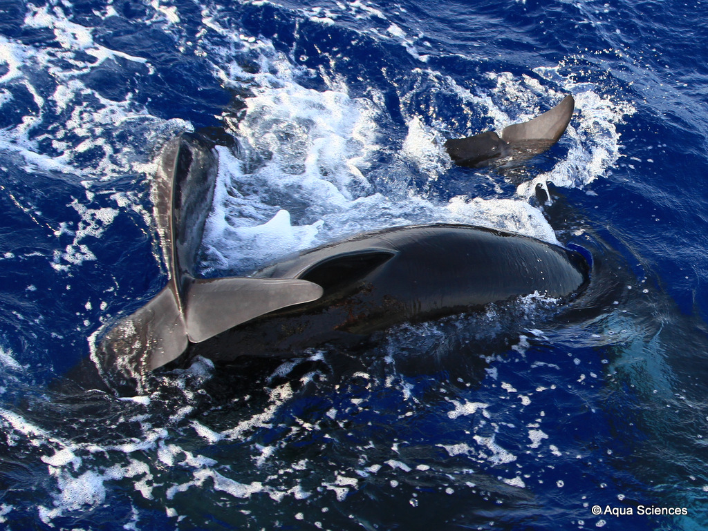 rorqual, puis 2 (sans doute une maman et son jeune) accompagnés de dauphins