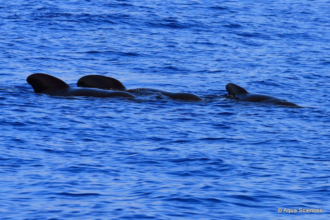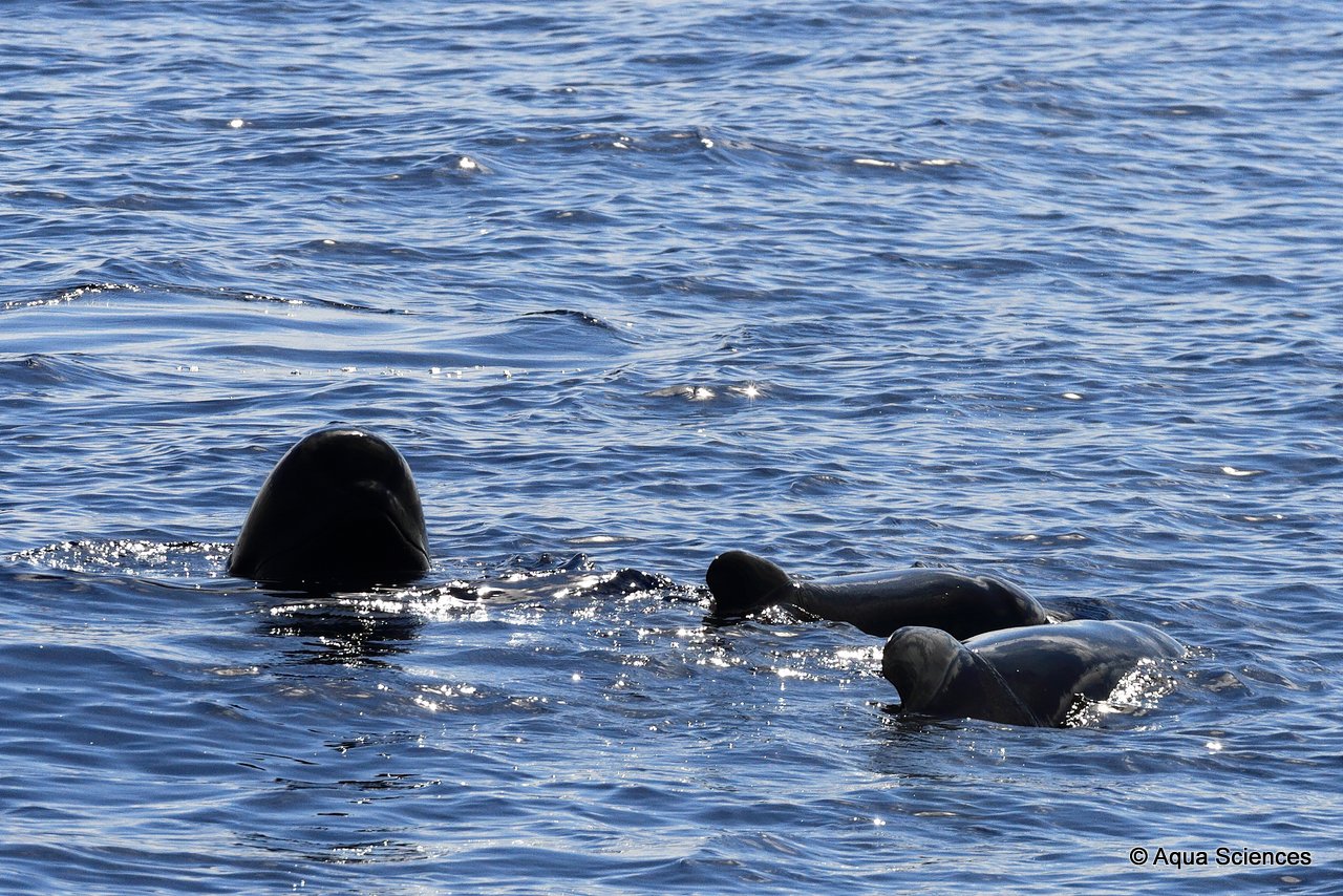 Notre regard s’arrêtera encore sur un groupe dispersé de globicéphales peu coopératifs et sur leur garde lorsqu’ils nous approchent…