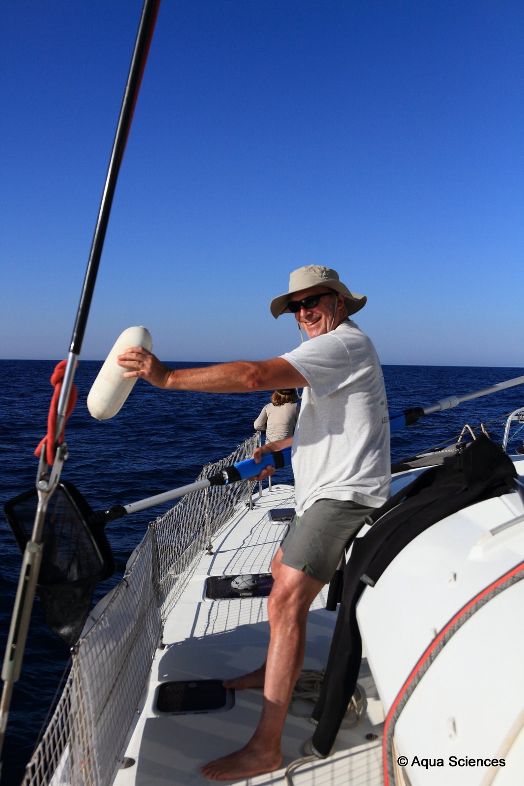 Malgré une houle importante, l’équipage de CATAZUR s’éloigne vers le large en espérant trouver le cachalot…sans oublier comme toujours de ramasser des déchets.