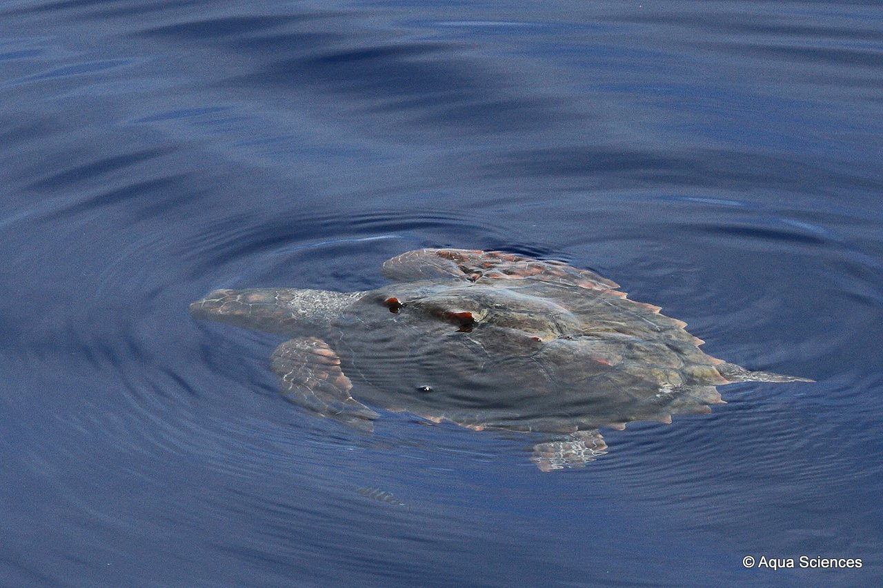 La mer de plus en plus calme nous facilite les observations, c’est alors que nous repérons une petite tortue Caouanne, peu affolée.